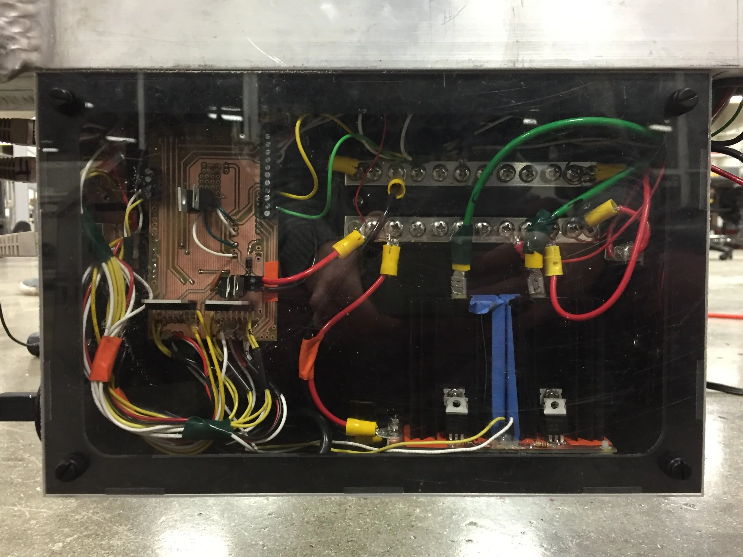The main controller is responsible for commanding the actuation of the AGSE's various parts. It is made up of an Arduino Mega, a custom PCB shield, and various H-bridge motor controllers. Shown to the right is an image of the main controller enclosure after I had just assembled it.
